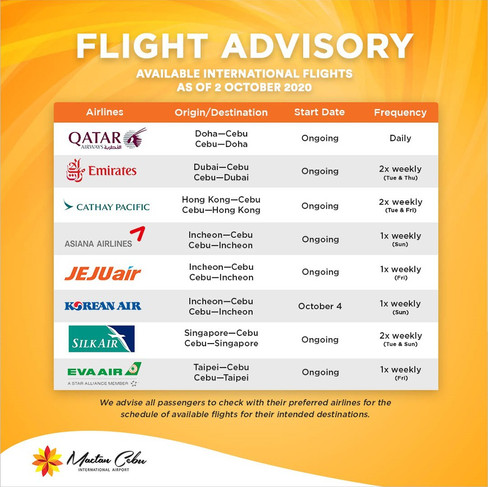 필리핀 세부에서 생활하고 있는데 한국으로 귀국하고자 한다면 방법은 두 가지이다. 마닐라로 와서 국제선을 타거나, 세부에서 국제선을 이용하는 것이다. 마닐라공항의 항공편이 세부공항보다 더 자주 있는 듯하지만 개인적으로는 날짜를 기다렸다가 세부공항을 이용하는 편을 추천하고 싶다. 세부공항 페이스북에 따르면 10월 2일 현재 세부공항에서 운항 계획 중인 한국행 국제선 노선은 아래와 같다.