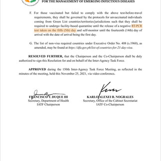 2021년 12월 1일부터 녹색국가(그린국가)에 해당하는 국가/지역에서 온 백신 예방접종완료자에 대해 필리핀 입국이 허용될 예정이다. 필리핀 도착 전 72시간(3일) 이내 발급된 음성확인서를 제출하면 시설 격리(facility-based quarantine) 및 도착 후 코로나 검사도 면제된다.