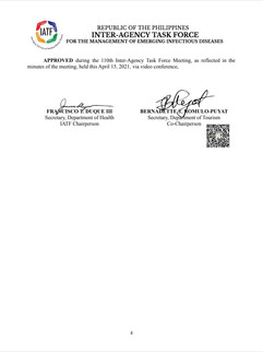 - 2021년 3월 22일 이전에 필리핀 외교부(DFA)로부터 예외적 입국승인을 받은 경우 : 외교부가 발행한 특별입국허가증(DFA Exemption) 필요